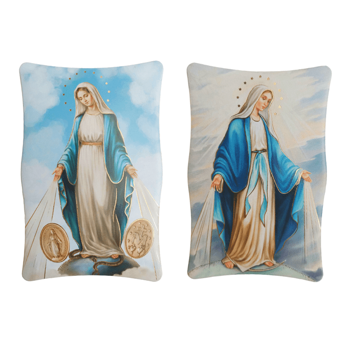 Obrazek przestawia Matkę Bożą Niepokalaną na jasnym tle w świetlistym otoczeniu
